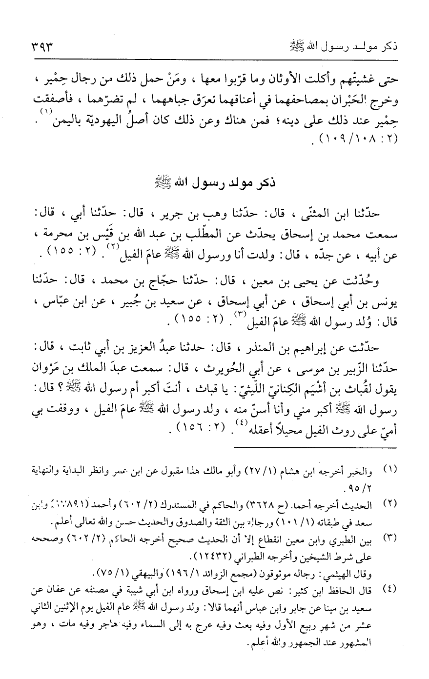 وحُدّثت عن يحيى بن معين، قال: حدَّثنا حجّاج بن محمد، قال: حدَّثنا يونس بن أبي إسحاق، عن أبي إسحاق، عن سعيد بن جُبير، عن ابن عبّاس، قال: وُلد رسول الله - صلى الله عليه وسلم - عامَ الفيل (٣). (٢: ١٥٥).