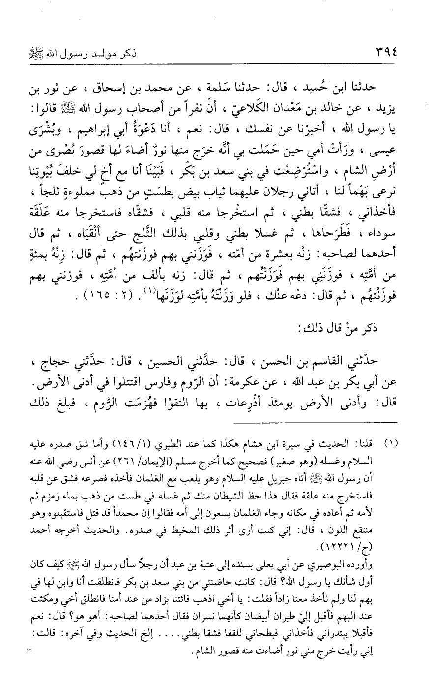حدثنا ابن حُميد، قال: حدثنا سَلمة، عن محمد بن إسحاق، عن ثور بن يزيد، عن خالد بن مَعْدان الكَلاعيّ، أنّ نفرًا من أصحاب رسول الله - صلى الله عليه وسلم - قالوا: يا رسول الله، أخبرْنا عن نفسك، قال: نعم، أنا دَعْوَةُ أبي إبراهيم، وبُشْرَى عيسى، ورَأتْ أمي حين حَمَلت بي أنَّه خرَج منها نورٌ أضاءَ لها قصورَ بُصْرى من أرْضِ الشام، واسْتُرْضِعْت في بني سعد بن بَكْر، فَبَينَا أنا مع أخٍ لي خلفَ بُيوتِنا نرعى بَهْمًا لنا، أتاني رجلان عليهما ثياب بيض بطسْتٍ من ذهب مملوءةٍ ثلجًا، فأخذاني، فشقّا بطني، ثم استخْرجا منه قلبي، فشقّاه فاستخرجا منه عَلَقَة سوداء، فَطَرَحاها، ثم غسلا بطني وقلبي بذلك الثَّلج حتى أنْقَيَاه، ثم قال أحدهما لصاحبه: زنْه بعشرة من أمّته، فَوَزَنني بهم فوزْنتهُم، ثم قال: زِنْهُ بمئةٍ من أمَّتِه، فوزَنَنِي بهم فَوَزَنْتُهم، ثم قال: زمنه بألف من أمَّتِهِ، فوزنني بهم فوزَنْتهُم، ثم قال: دعْه عنْك، فلو وَزَنتهُ بأمَّتِه لوَزَنَها (١). (٢: ١٦٥).