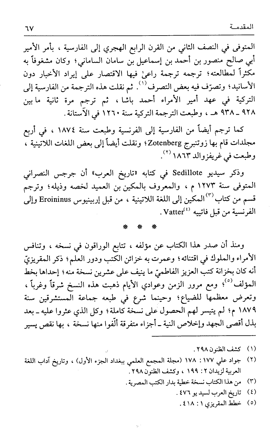 وذكر سيديو Sedillote كتابه "تاريخ العرب" أن جرجس النصراني المتوفى سنة ١٢٧٣ م، والمعروف بالمكين بن العميد لخصه وذيله؛ وترجم قسم من كتاب (٣) المكين إلى اللغة اللاتينية، من قبل إربينيوس Eroininus وإلى الفرنسية من قبل فاتييه (٤) Vatter.