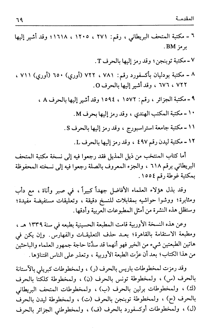 وقد رمزت لمخطوطات باريس بالحرف (ر)، ولمخطوطات كبريلي بالآستانة بالحرف (س)، ولمخطوطة تونس بالحرف (ن)، ولمخطوطة كلكتا بالحرف (ك)، ولمخطوطات برلين بالحرف (ب)، ولمخطوطات المتحف البريطاني بالحرف (ح)، ولمخطوطة توبنجن بالحرف (ت)، ولمخطوطة ليدن بالحرف (ل)، ولمخطوطات أوكسفورد بالحرف (ف)، ولمخطوطتي الجزائر بالحرف