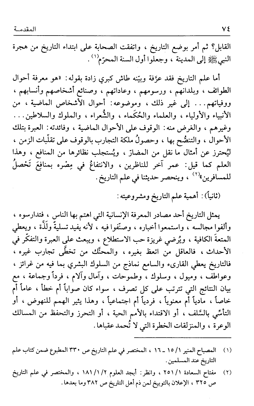(٢) مفتاح السعادة ١/ ٢٥١، وانظر: أبجد العلوم ٢/ ١ / ١٨١، والمختصر في علم التاريخ ص ٣٢٥، الإعلان بالتوبيخ لمن ذم أهل التاريخ ص ٣٨٢ وما بعدها.