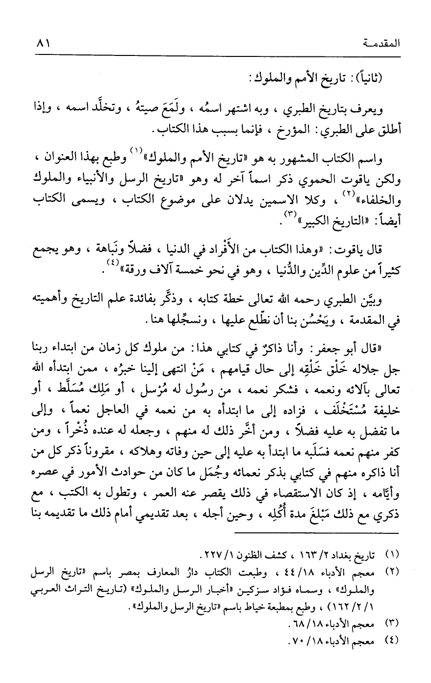 (٢) معجم الأدباء ١٨/ ٤٤، وطبعت الكتاب دارُ المعارف بمصر باسم "تاريخ الرسل والملوك" وسماه فؤاد سزكين "أخبار الرسل والملوك" (تاريخ التراث العربي ١/ ٢ / ١٦٢)، وطبع بمطبعة خياط باسم "تاريخ الرسل والملوك".