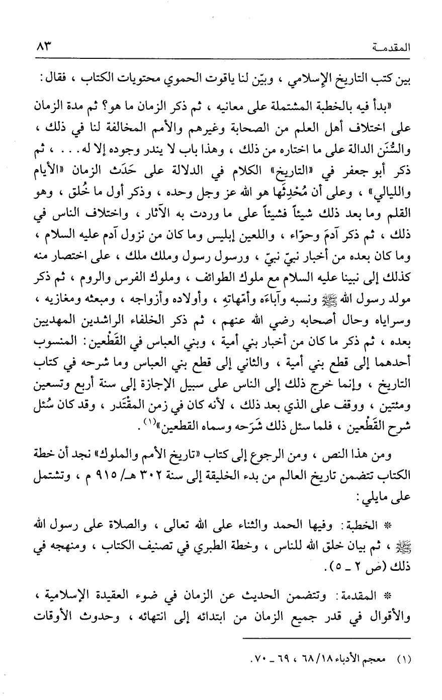 * الخطبة: وفيها الحمد والثناء على الله تعالى، والصلاة على رسول الله - صلى الله عليه وسلم -، ثم بيان خلق الله للناس، وخطة الطبري في تصنيف الكتاب، ومنهجه في ذلك (ص ٢ - ٥).