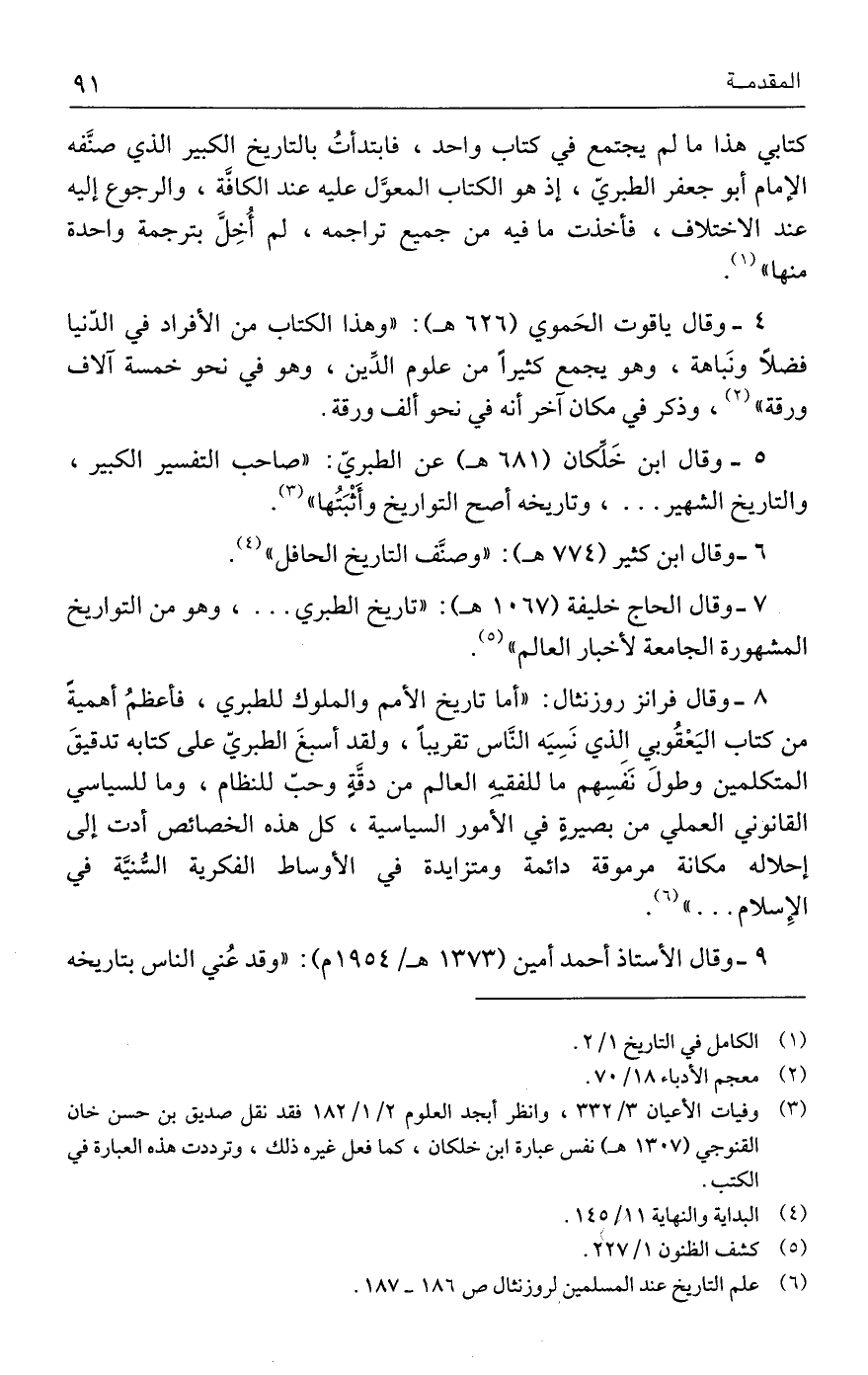 ٨ - وقال فرانز روزنثال: "أما تاريخ الأمم والملوك للطبري، فأعظمُ أهميةً من كتاب اليَعْقُوبي الِذي نَسِيَه النَّاس تقريبًا، ولقد أسبغَ الطبريّ على كتابه تدقيقَ المتكلمين وطولَ نَفسِهم ما للفقيهِ العالم من دقَّةٍ وحبّ للنظام، وما للسياسي القانوني العملي من بصيرةٍ في الأمور السياسية، كل هذه الخصائص أدت إلى إحلاله مكانة مرموقة دائمة ومتزايدة في الأوساط الفكرية السُّنيَّة في الإِسلام. . ." (٦).