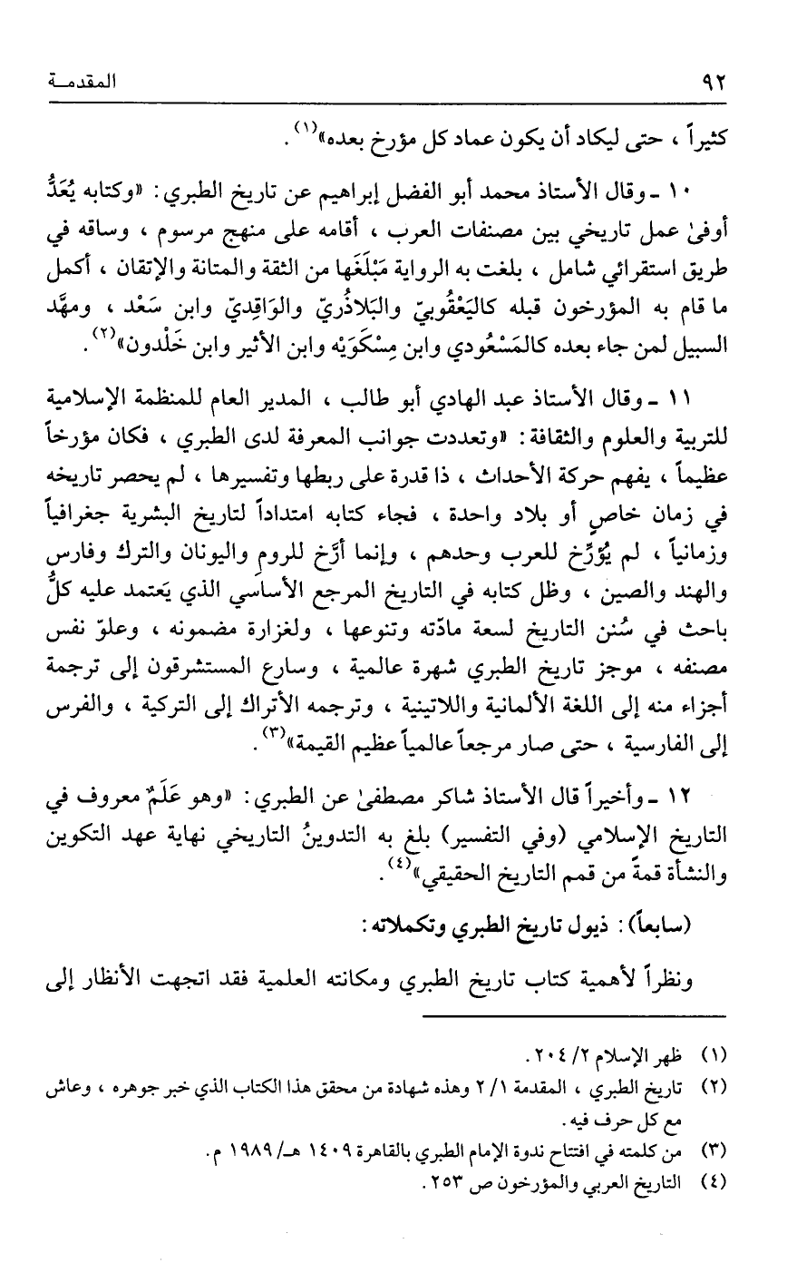 ١٠ - وقال الأستاذ محمد أبو الفضل إبراهيم عن تاريخ الطبري: "وكتابه يُعَدُّ أوفى عمل تاريخي بين مصنفات العرب، أقامه على منهج مرسوم، وساقه في طريق استقرائي شامل، بلغت به الرواية مَبْلَغَها من الثقة والمتانة والإتقان، أكمل ما قام به المؤرخون قبله كاليَعْقُوبي والبَلاذُريّ والوَاقِديّ وابن سَعْد، ومهَّد السبيل لمن جاء بعده كالمَسْعُودي وابن مِسْكَوَيه وابن الأثير وابن خَلْدون" (٢).