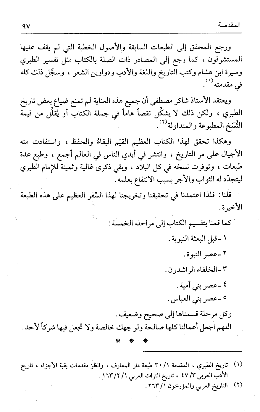 (١) تاريخ الطبري، المقدمة ١/ ٣٠ طبعة دار المعارف، وانظر مقدمات بقية الأجزاء، تاريخ الأدب العربي ٣/ ٤٧، تاريخ التراث العربي ١/ ٢ / ١٦٣.