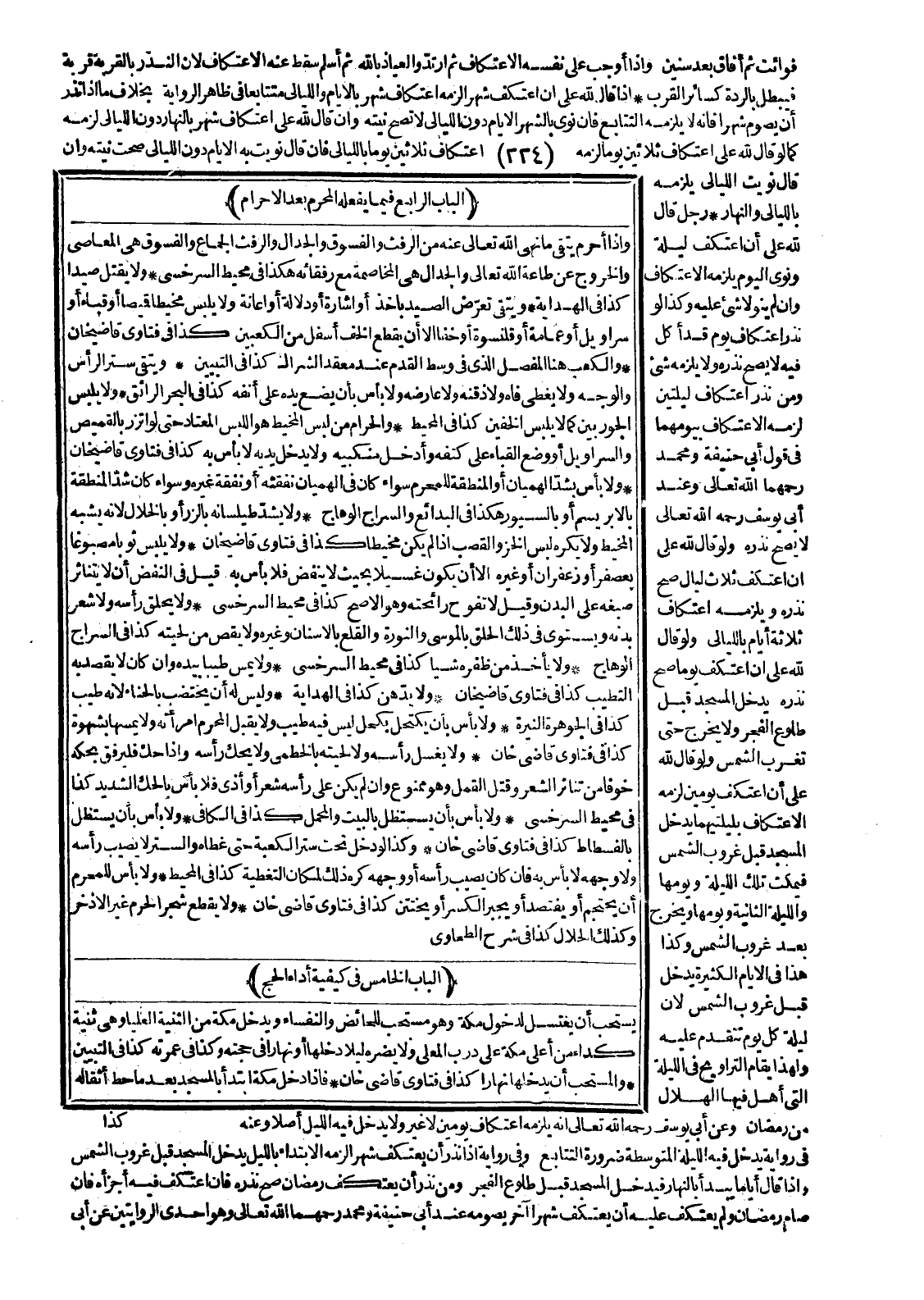 (الْبَابُ الرَّابِعُ فِيمَا يَفْعَلُهُ الْمُحْرِمُ بَعْدَ الْإِحْرَامِ) ، وَإِذَا أَحْرَمَ يَتَّقِي مَا نَهَى اللَّهُ تَعَالَى عَنْهُ مِنْ الرَّفَثِ وَالْفُسُوقِ وَالْجِدَالِ، وَالرَّفَثُ الْجِمَاعُ وَالْفُسُوقُ هِيَ الْمَعَاصِي وَالْخُرُوجُ عَنْ طَاعَةِ اللَّهِ تَعَالَى، وَالْجِدَالُ هِيَ الْمُخَاصَمَةُ مَعَ رُفَقَائِهِ، هَكَذَا فِي مُحِيطِ السَّرَخْسِيِّ وَلَا يَقْتُلُ صَيْدًا كَذَا فِي الْهِدَايَةِ وَيَتَّقِي تَعَرُّضَ الصَّيْدِ بِأَخْذٍ أَوْ إشَارَةٍ أَوْ دَلَالَةٍ أَوْ إعَانَةٍ وَلَا يَلْبَسُ مَخِيطًا قَمِيصًا أَوْ قَبَاءً أَوْ سَرَاوِيلَ أَوْ عِمَامَةً أَوْ قَلَنْسُوَةً أَوْ خُفًّا إلَّا أَنْ يَقْطَعَ الْخُفَّ أَسْفَلَ مِنْ الْكَعْبَيْنِ، كَذَا فِي فَتَاوَى قَاضِي خَانْ وَالْكَعْبُ هُنَا الْمَفْصِلُ الَّذِي فِي وَسْطِ الْقَدَمِ عِنْدَ مَعْقِدِ الشِّرَاكِ كَذَا فِي التَّبْيِينِ وَيَتَّقِي سَتْرَ الرَّأْسِ وَالْوَجْهِ وَلَا يُغَطِّي فَاهُ وَلَا ذَقَنَهُ وَلَا عَارِضَهُ، وَلَا بَأْسَ بِأَنْ يَضَعَ يَدَهُ عَلَى أَنْفِهِ كَذَا فِي الْبَحْرِ الرَّائِقِ.