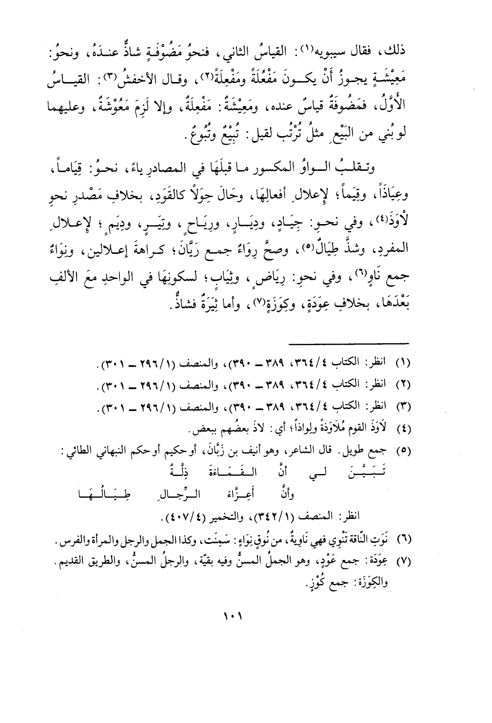 وتقلب الْوَاو المكسور مَا قبلهَا فِي المصادر يَاء نَحْو قيَاما وعياذا وقيما لإعلال أفعالها وَحَال حولا كالقود بِخِلَاف مصدر نَحْو لاوذ وَفِي نَحْو جِيَاد وديار ورياح وتير وديم لإعلال الْمُفْرد وشذ طيال وَصَحَّ رواء جمع رَيَّان كَرَاهَة إعلالين ونواء جمع ناو وَفِي نَحْو رياض وَثيَاب لسكونها فِي الْوَاحِد مَعَ الْألف بعْدهَا بِخِلَاف عودة وكوزة وَأما ثيرة فشاذ