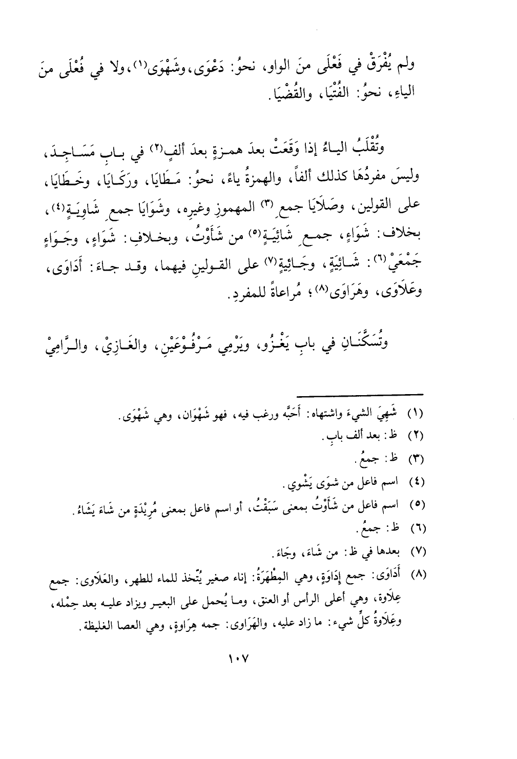 وتقلب الْيَاء إِذا وَقعت بعد همزَة بعد ألف فِي بَاب مَسَاجِد وَلَيْسَ مفردها كَذَلِك ألفا والهمزة يَاء نَحْو مطايا وركايا وخطايا على الْقَوْلَيْنِ وصلايا جمع المهموز وَغَيره وشوايا جمع شاوية بِخِلَاف شواء جمع شائية من شأوت وَبِخِلَاف شواء وجواء جمعي شائية وجائية على الْقَوْلَيْنِ فيهمَا وَقد جَاءَ أداوى وعلاوى وهراوى مُرَاعَاة للمفرد