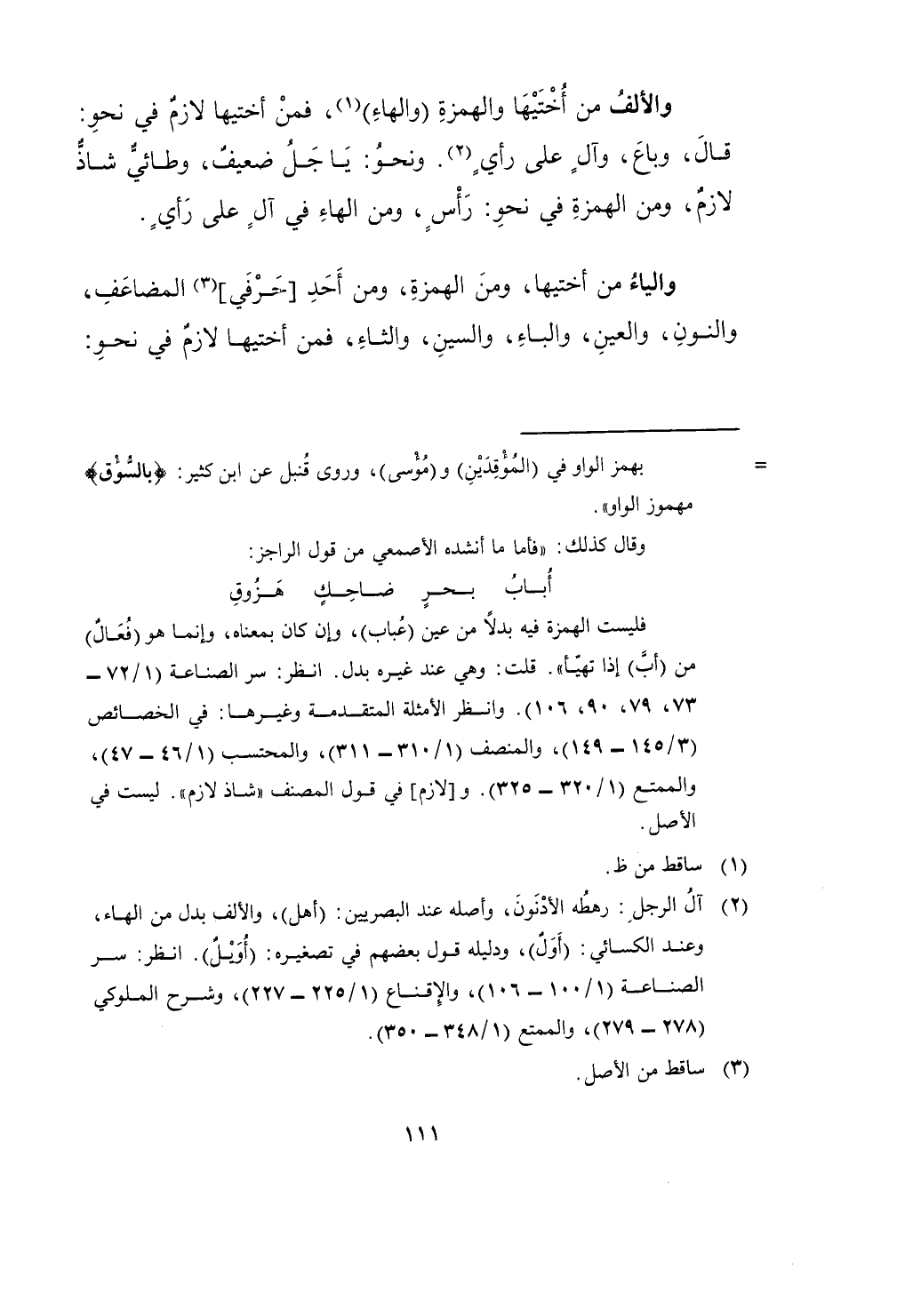 وَالْألف من أختيها والهمزة وَالْهَاء فَمن أختيها لَازم فِي نَحْو قَالَ وَبَاعَ وَآل على رَأْي وَنَحْو يَا جلّ ضَعِيف وطائي شَاذ لَازم وَمن الْهمزَة فِي نَحْو رَأس وَمن الْهَاء فِي آل على رَأْي