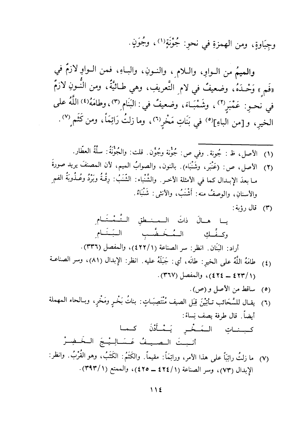 وَالْمِيم من الْوَاو وَاللَّام وَالنُّون فَمن الْوَاو لَازم فِي فَم وَحده وَضَعِيف فِي لَام التَّعْرِيف وَهِي طائية وَمن النُّون لَازم فِي نَحْو عمبر وشمباء وَضَعِيف فِي البنام وطامه الله على الْخَيْر وَمن الْبَاء فِي بنان مخر وَمَا زلت راتما وَمن كثم