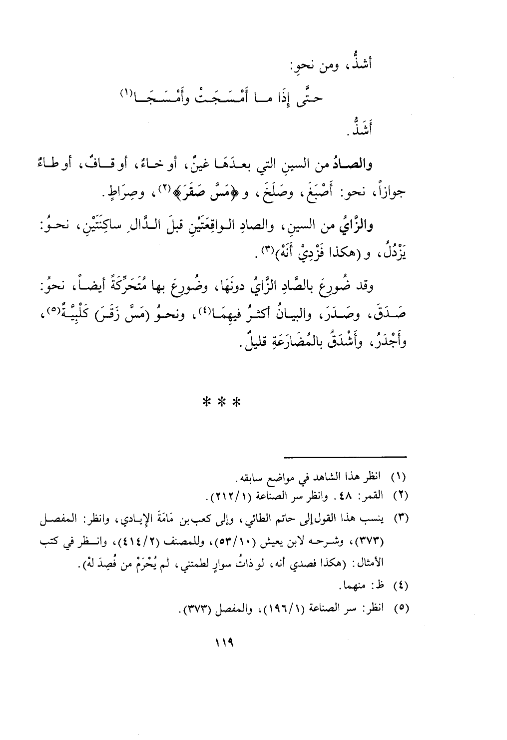 وَالصَّاد من السِّين الَّتِي بعْدهَا غين أَو خاء أَو قَاف أَو طاء جَوَازًا نَحْو أصبغ وصلخ وَمَسّ صقر وصراط