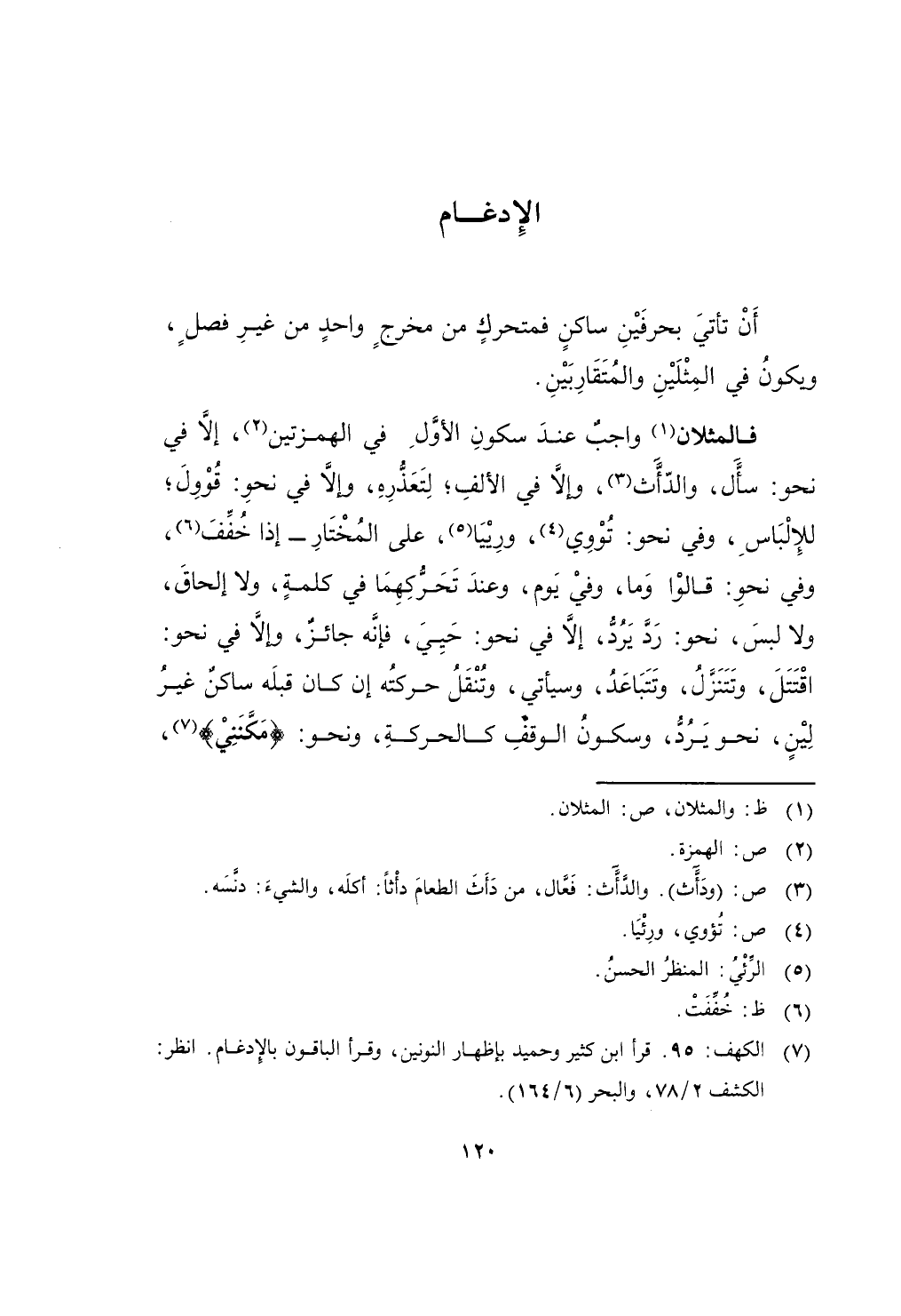 فالمثلان وَاجِب عِنْد سُكُون الأول فِي الهمزتين إِلَّا فِي نَحْو سَأَلَ والدأث وَإِلَّا فِي الْألف لتعذره وَإِلَّا فِي نَحْو قوول للإلباس وَفِي نَحْو تووي ورييا على الْمُخْتَار إِذا خفف وَفِي نَحْو قَالُوا وَمَا وَفِي يَوْم وَعند تحركهما فِي كلمة وَلَا إِلْحَاق وَلَا لبس نَحْو رد يرد إِلَّا فِي نَحْو حييّ فَإِنَّهُ جَائِز وَإِلَّا فِي نَحْو اقتتل وتتنزل وتتباعد وَسَيَأْتِي وتنقل حركته إِن كَانَ قبله سَاكن غير لين نَحْو يرد وَسُكُون الْوَقْف كالحركة وَنَحْو {مكني}