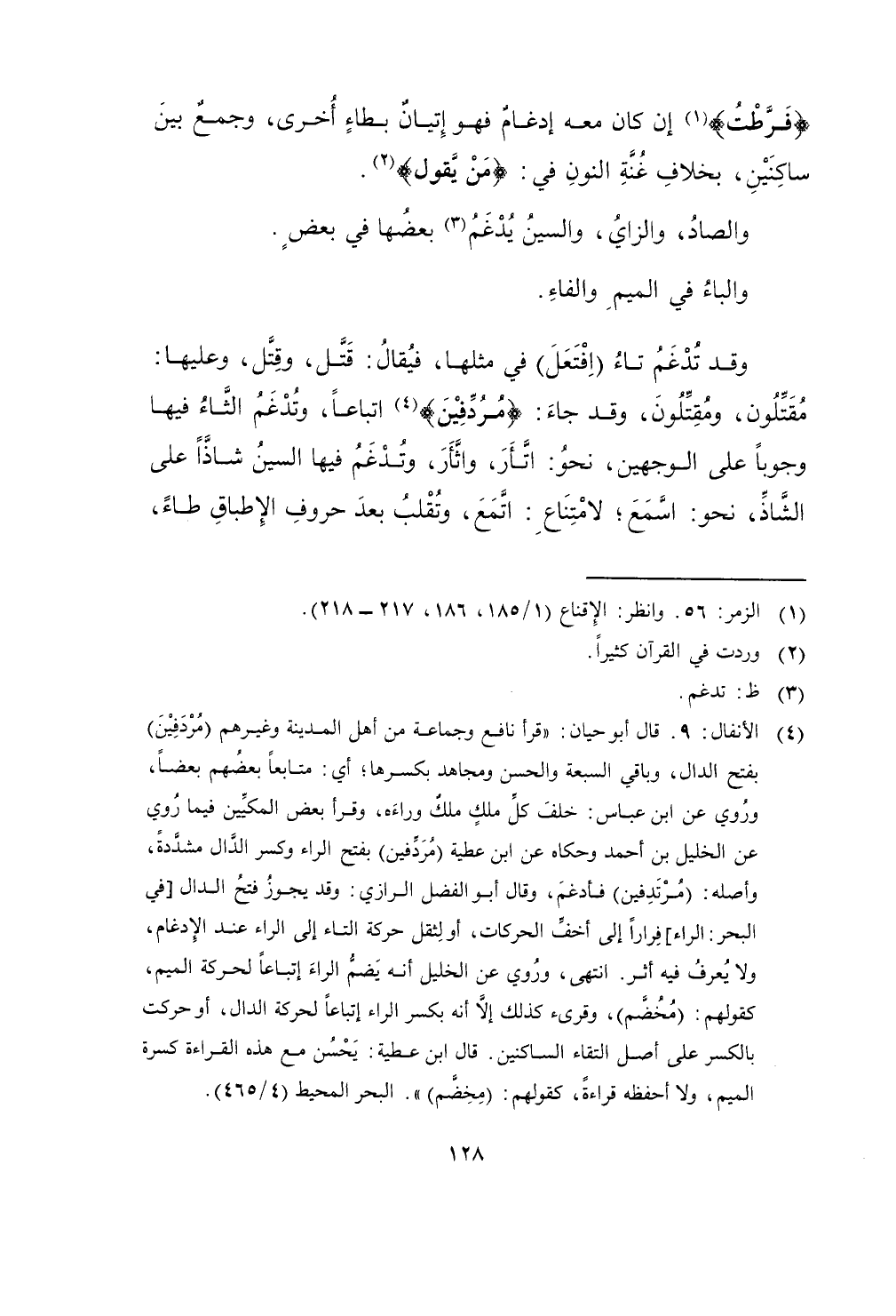 {فرطت} إِن كَانَ مَعَه إدغام فَهُوَ إتْيَان بطاء أُخْرَى وَجمع بَين ساكنين بِخِلَاف غنة النُّون فِي {من يَقُول}