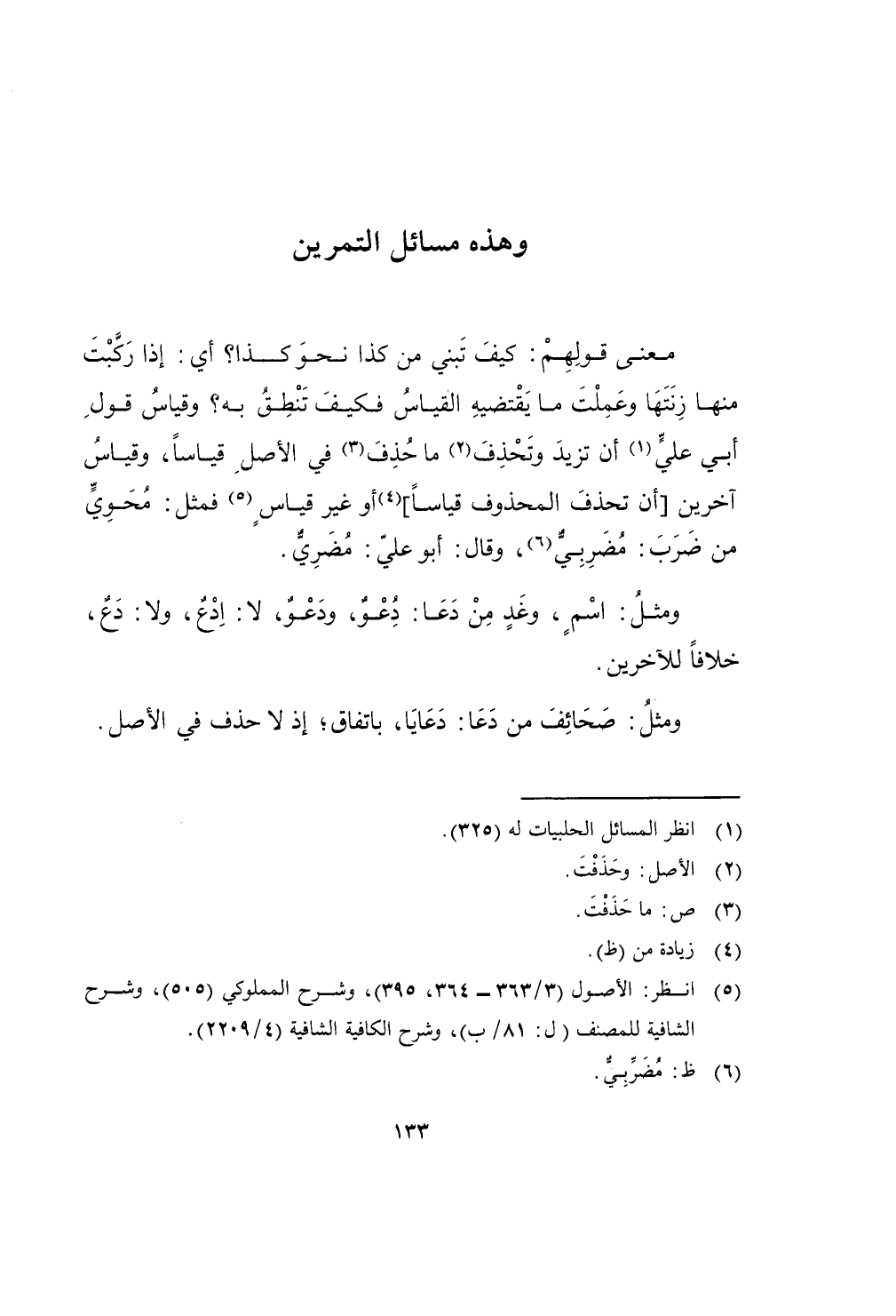معنى قَوْلهم كَيفَ تبني من كَذَا نَحْو كَذَا أَي إِذا ركبت مِنْهَا زنتها وعملت مَا يَقْتَضِيهِ الْقيَاس فَكيف تنطق بِهِ وَقِيَاس قَول أبي عَليّ أَن تزيد وتحذف مَا حذف فِي الأَصْل قِيَاسا وَقِيَاس آخَرين أَن تحذف الْمَحْذُوف قِيَاسا أَو غير قِيَاس فَمثل محوي من ضرب مضربي وَقَالَ أَبُو عَليّ مُضَرِي