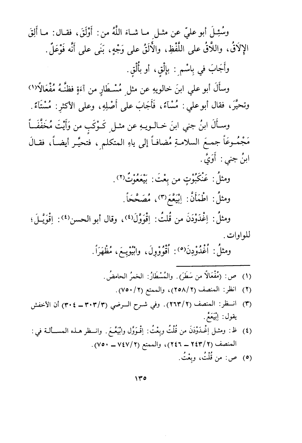 وسألو أَبُو عَليّ ابْن خالويه عَن مثل مسطار من آءة فَظَنهُ مفعالا وتحير فَقَالَ أَبُو عَليّ مسَاء فَأجَاب على أَصله وعَلى الْأَكْثَر مستاء
