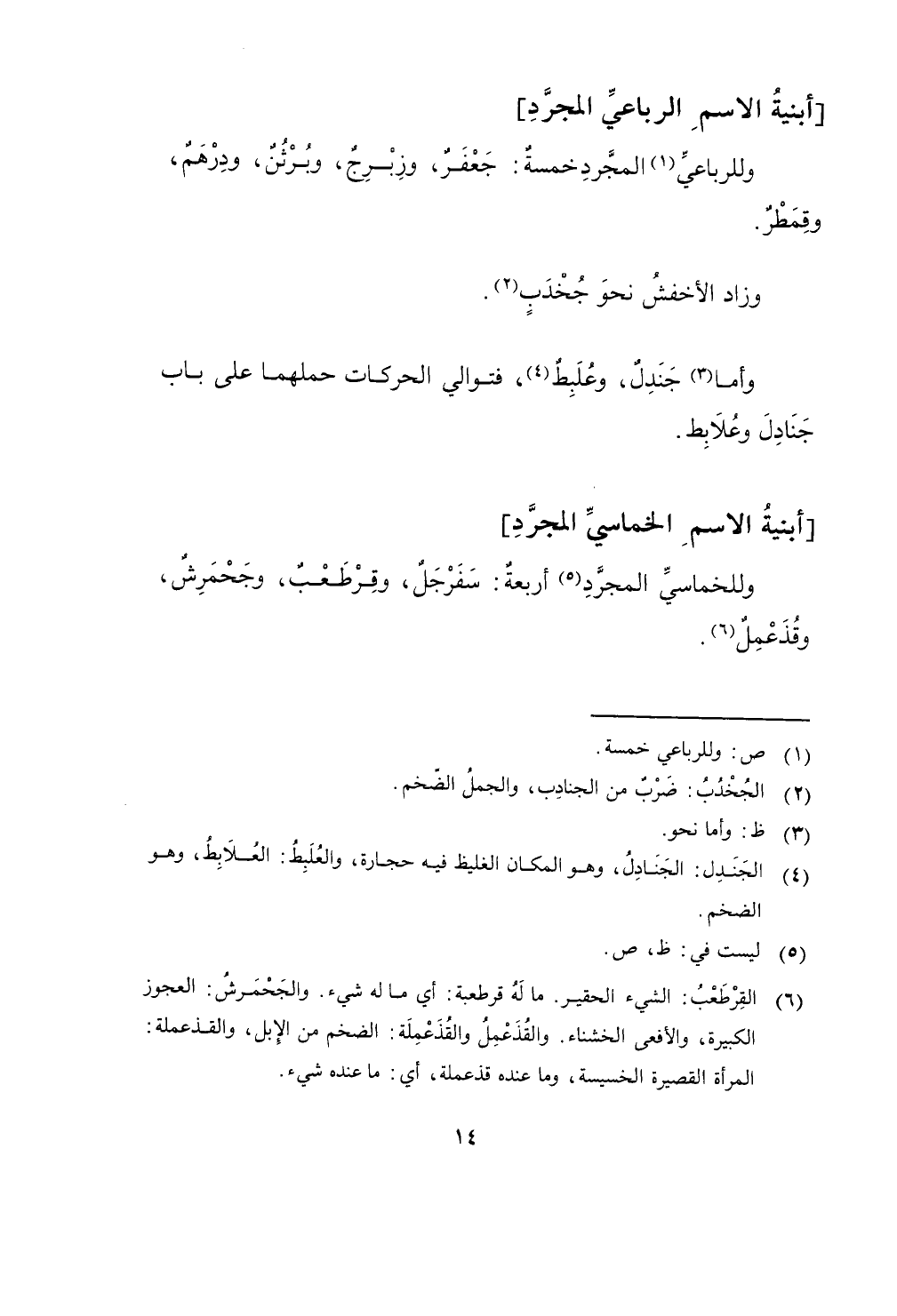 وللخماسي الْمُجَرّد أَرْبَعَة سفرجل وقرطعب وجحمرش وقذعمل