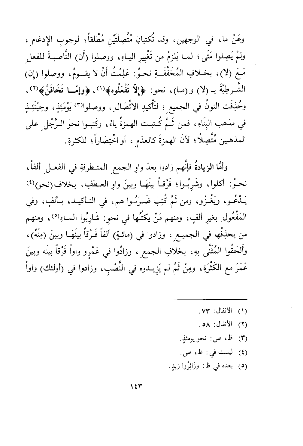 وَأما الزِّيَادَة فَإِنَّهُم زادوا بعد وَاو الْجمع المتطرفة فِي الْفِعْل ألفا نَحْو أكلُوا وَشَرِبُوا فرقا بَينهَا وَبَين وَاو الْعَطف بِخِلَاف نَحْو يَدْعُو ويغزو وَمن ثمَّ كتب ضربوا هم فِي التَّأْكِيد بِأَلف وَفِي الْمَفْعُول بِغَيْر ألف وَمِنْهُم من يَكْتُبهَا فِي نَحْو شاربوا المَاء وَمِنْهُم من يحذفها فِي الْجَمِيع وَزَادُوا فِي مائَة ألفا فرقا بَينهَا وَبَين مِنْهُ وألحقوا الْمثنى بِهِ بِخِلَاف الْجمع وَزَادُوا فِي عَمْرو واوا فرقا بَينه وَبَين عمر مَعَ الْكَثْرَة وَمن ثمَّ لم يزيدوه فِي النصب وَزَادُوا فِي أُولَئِكَ واوا