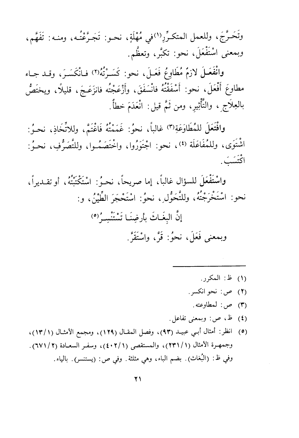 وتحرج وللعمل المتكرر فِي مهلة نَحْو تجرعته وَمِنْه تفهم وَبِمَعْنى استفعل نَحْو تكبر وتعظم