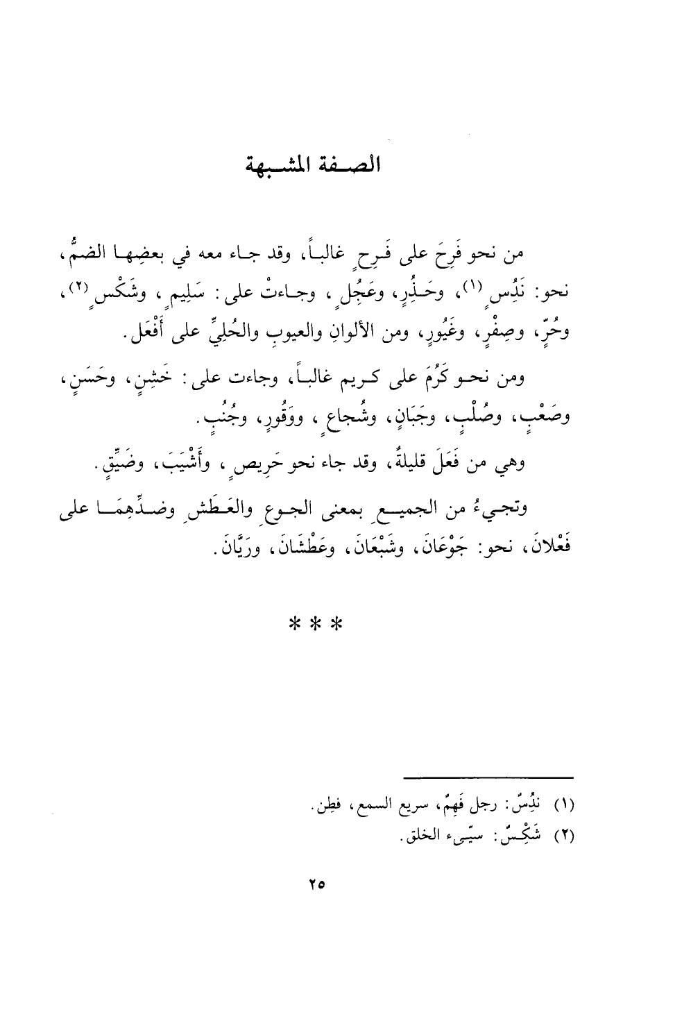 وَمن نَحْو كرم على كريم غَالِبا وَجَاءَت على خشن وَحسن وصعب وصلب وجبان وشجاع ووقور وجنب