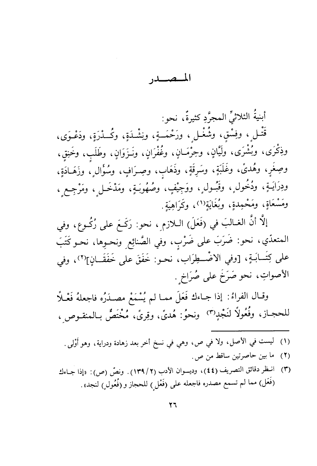 وَقَالَ الْفراء إِذا جَاءَك فعل مِمَّا لم يسمع مصدره فاجعله فعلا للحجاز وفعولا لنجد وَنَحْو هدى وقرى مُخْتَصّ بالمنقوص
