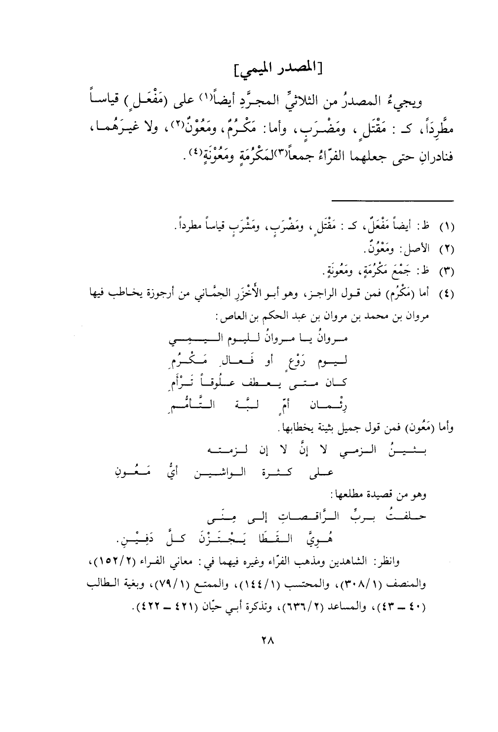 وَيَجِيء الْمصدر من الثلاثي الْمُجَرّد أَيْضا على مفعل قِيَاسا مطردا ك مقتل ومضرب وَأما مكرم ومعون وَلَا غَيرهمَا فنادران حَتَّى جَعلهمَا الْفراء جمعا لمكرمة ومعونة