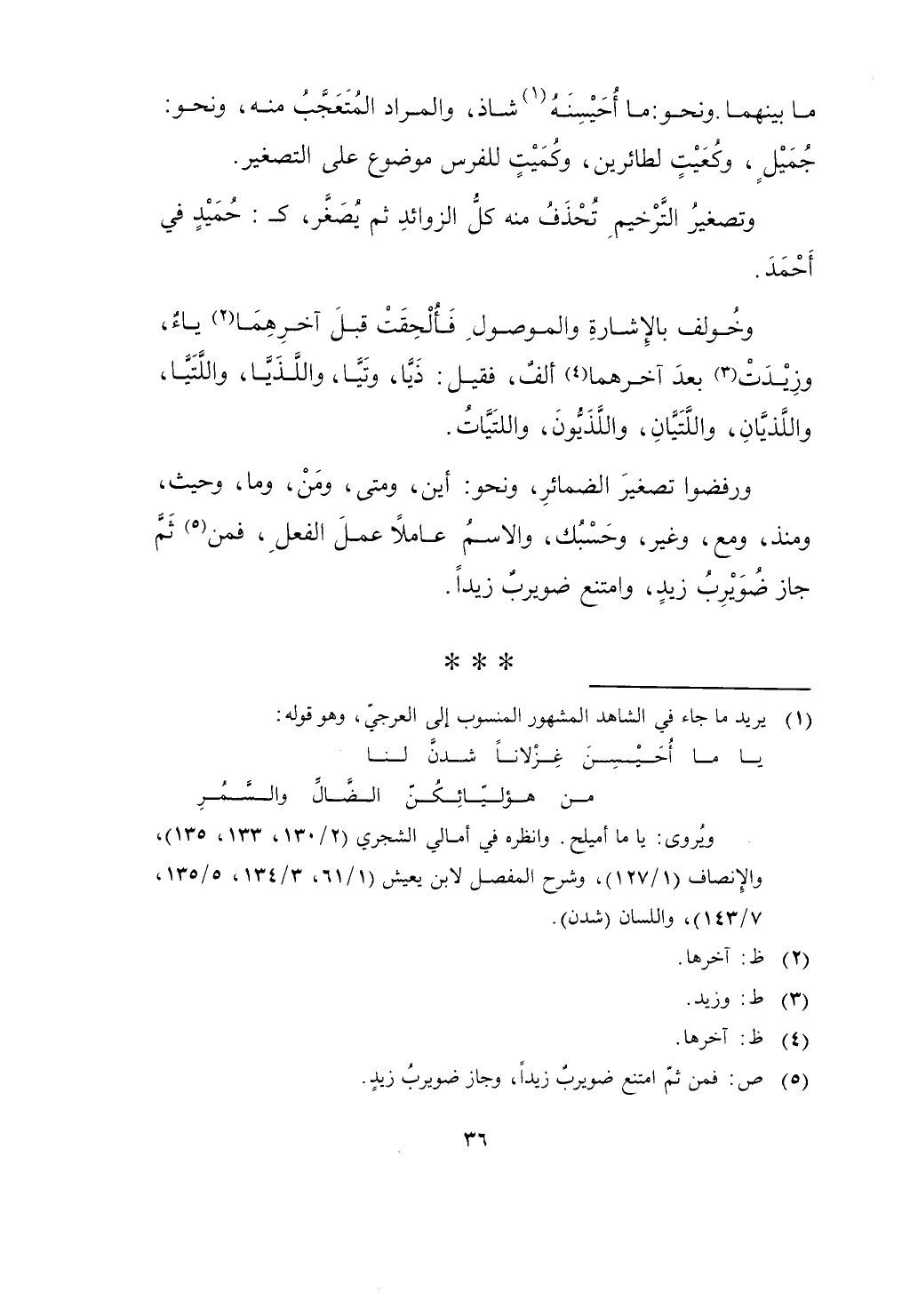 مَا بَينهمَا وَنَحْو مَا أحيسنه شَاذ وَالْمرَاد المتعجب مِنْهُ وَنَحْو جميل وكعيت لطائرين وكميت للْفرس مَوْضُوع على التصغير
