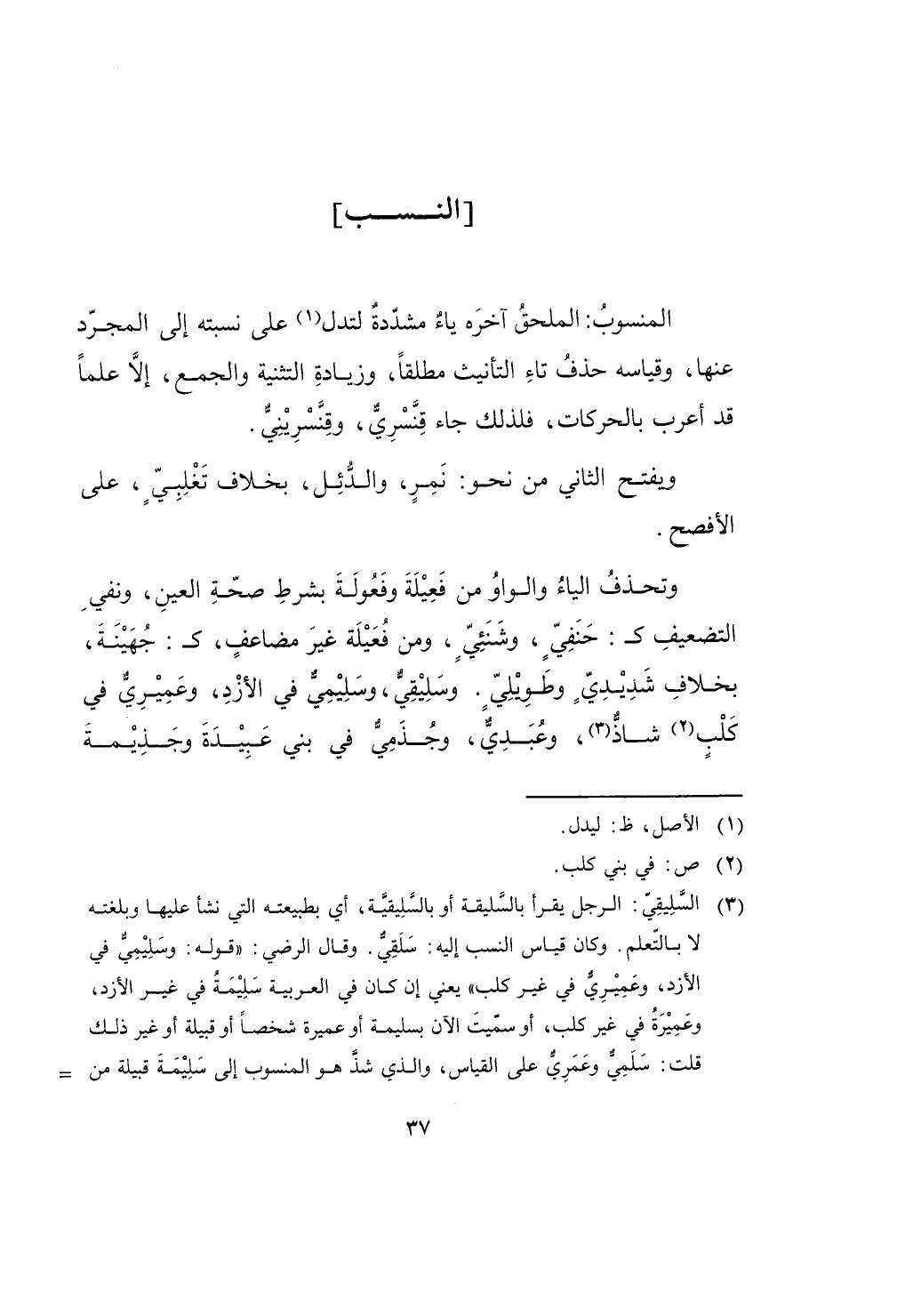 الْمَنْسُوب الملحق آخِره يَاء مُشَدّدَة لتدل على نسبته إِلَى الْمُجَرّد عَنْهَا وَقِيَاسه حذف تَاء التَّأْنِيث مُطلقًا وَزِيَادَة التَّثْنِيَة وَالْجمع إِلَّا علما قد أعرب بالحركات فَلذَلِك جَاءَ قنسري وقنسريني