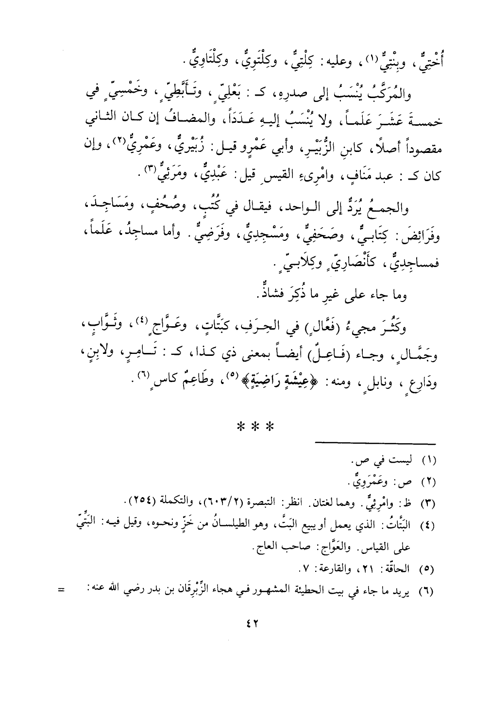 والمركب ينْسب إِلَى صَدره ك بعلي وتأبطي وخمسي فِي خَمْسَة عشر علما وَلَا ينْسب إِلَيْهِ عددا والمضاف إِن كَانَ الثَّانِي مَقْصُودا أصلا كَابْن الزبير وَأبي عَمْرو قيل زبيري وعمري وَإِن كَانَ ك عبد منَاف وامرئ الْقَيْس قيل عَبدِي ومرئي