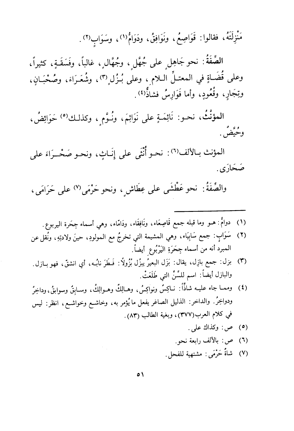وَالصّفة نَحْو عطشى على عطاش وَنَحْو حرمى على حرامى