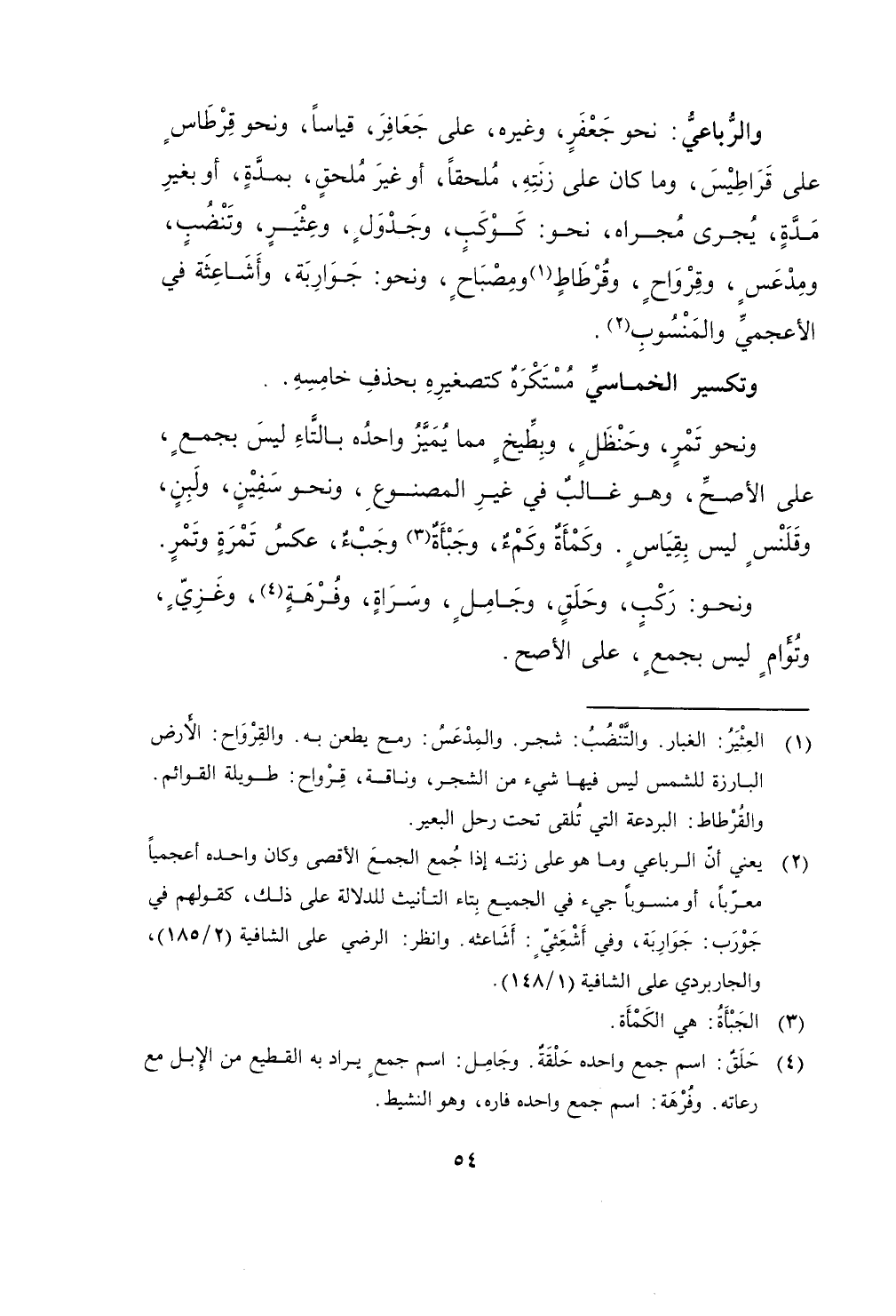 والرباعي نَحْو جَعْفَر وَغَيره على جعافر قِيَاسا وَنَحْو قرطاس على قَرَاطِيس وَمَا كَانَ على زنته مُلْحقًا أَو غير مُلْحق بِمدَّة أَو بِغَيْر مُدَّة يجرى مجْرَاه نَحْو كَوْكَب وجدول وعثير وتنضب ومدعس وقرواح وقرطاط ومصباح وَنَحْو جواربة وأشاعثة فِي الأعجمي والمنسوب
