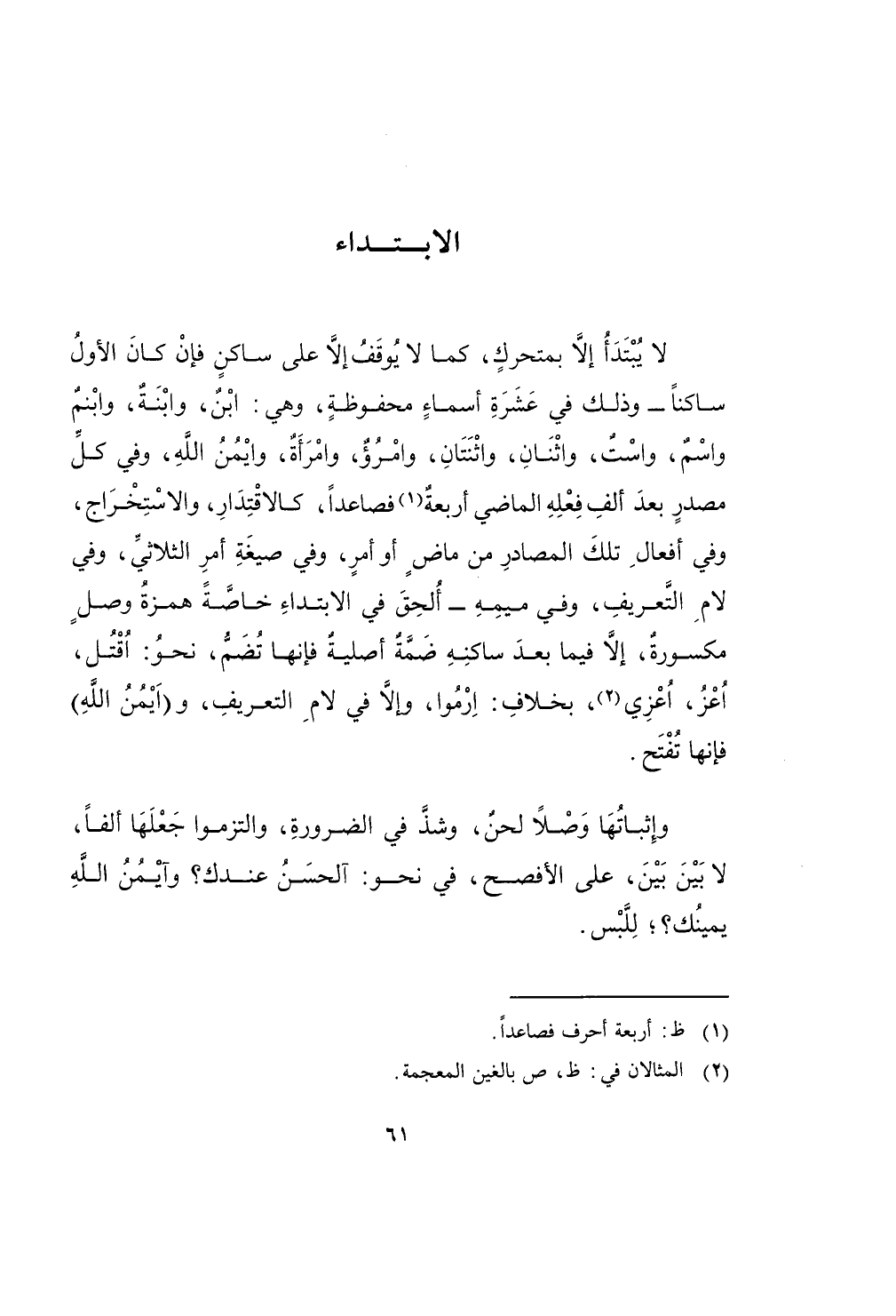 لَا يبتدأ إِلَّا بمتحرك كَمَا لَا يُوقف إِلَّا على سَاكن فَإِن كَانَ الأول سَاكِنا وَذَلِكَ فِي عشرَة أَسمَاء مَحْفُوظَة وَهِي ابْن وَابْنَة وابنم وَاسم واست وثنان وَاثْنَتَانِ وامرؤ وَامْرَأَة وايمن الله وَفِي كل مصدر بعد ألف فعله الْمَاضِي أَرْبَعَة فَصَاعِدا كالاقتدار والاستخراج وَفِي أَفعَال تِلْكَ المصادر من مَاض أَو أَمر وَفِي صِيغَة أَمر الثلاثي وَفِي لَام التَّعْرِيف وَفِي ميمه ألحق فِي الِابْتِدَاء خَاصَّة همزَة وصل مَكْسُورَة إِلَّا فِيمَا بعد ساكنه ضمة أَصْلِيَّة فَإِنَّهَا تضم نَحْو اقْتُل اعز اعزي بِخِلَاف ارموا وَإِلَّا فِي لَام التَّعْرِيف وايمن الله فَإِنَّهَا تفتح