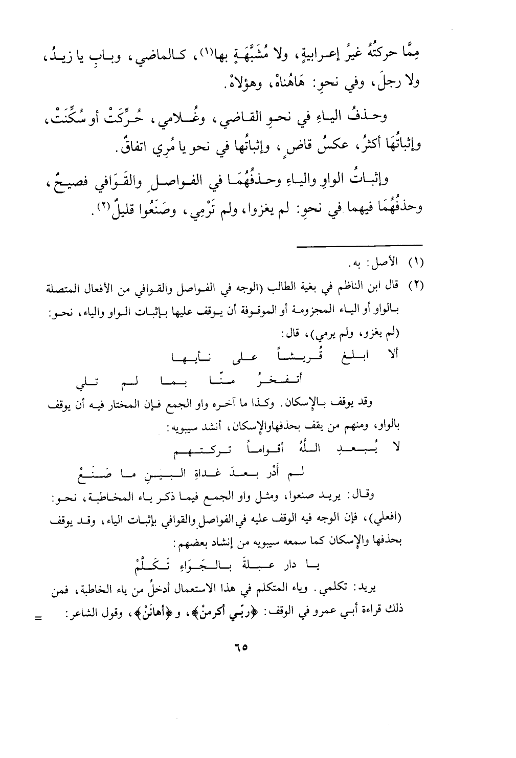 وَإِثْبَات الْوَاو وَالْيَاء وحذفهما فِي الفواصل والقوافي فصيح وحذفهما فيهمَا فِي نَحْو لم يغزوا وَلم ترمي وصنعوا قَلِيل