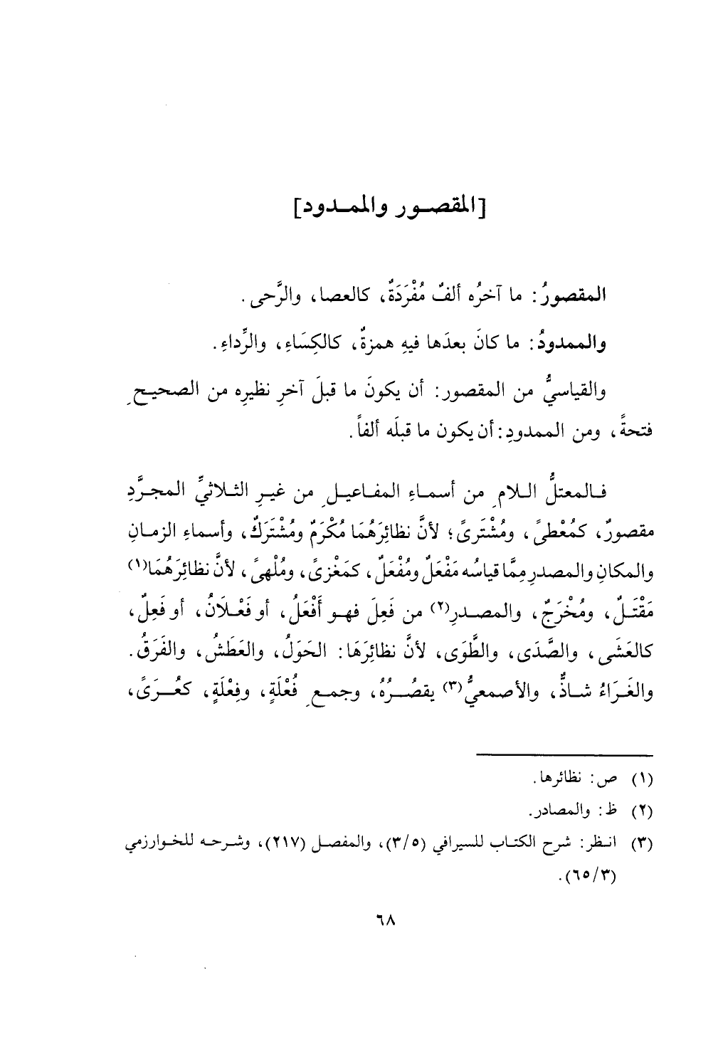 فالمعتل اللَّام من أَسمَاء المفاعيل من غير الثلاثي الْمُجَرّد مَقْصُور كمعطى ومشترى لِأَن نظائرهما مكرم ومشترك وَأَسْمَاء الزَّمَان وَالْمَكَان والمصدر مِمَّا قِيَاسه مفعل ومفعل كمغزى وملهى لِأَن نظائرهما مقتل ومخرج والمصدر من فعل فَهُوَ أفعل أَو فعلان أَو فعل كالعشى والصدى والطوى لِأَن نظائرها الْحول والعطش وَالْفرق والغراء شَاذ والأصمعي يقصره وَجمع فعلة وفعلة كعرى