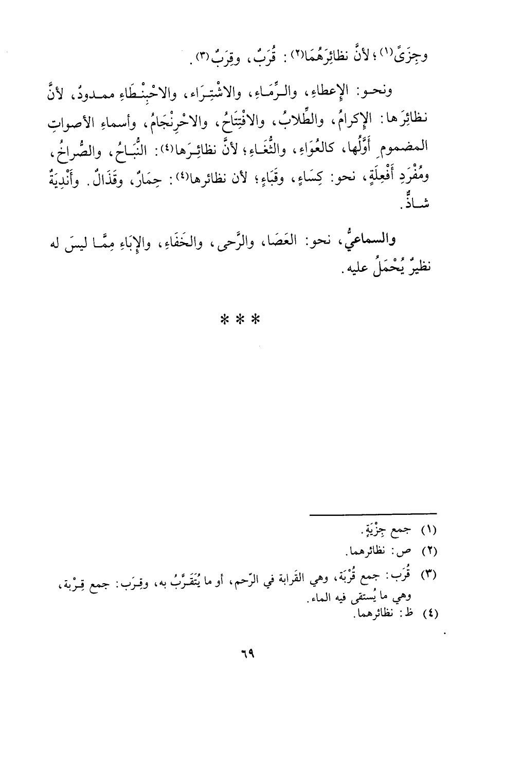 وَنَحْو الْإِعْطَاء والرماء والاشتراء والاحبنطاء مَمْدُود لِأَن نظائرها الْإِكْرَام والطلاب والافتتاح والاحرنجام وَأَسْمَاء الْأَصْوَات المضموم أَولهَا كالعواء والثغاء لِأَن نظائرها النباح والصراخ ومفرد أفعلة نَحْو كسَاء وقباء لِأَن نظائرها حمَار وقذال وأندية شَاذ