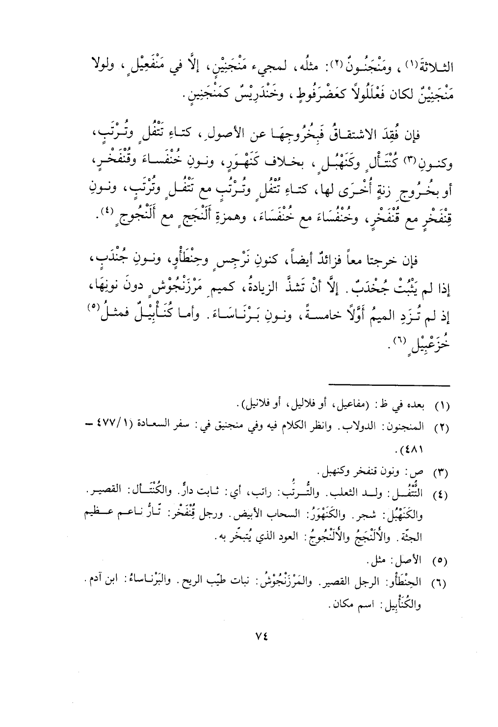 الثَّلَاثَة ومنجنون مثله لمجيء منجنين إِلَّا فِي منفعيل وَلَوْلَا منجنين لَكَانَ فعللولا كعضرفوط وخندريس كمنجنين