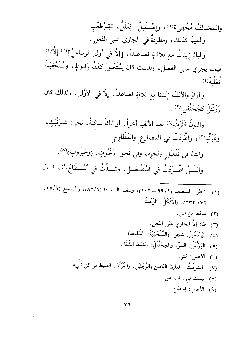وَالنُّون كثرت بعد الْألف آخرا أَو ثَالِثَة سَاكِنة نَحْو شرنبث وعرند واطردت فِي الْمُضَارع والمطاوع