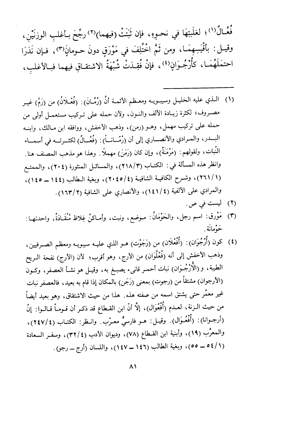 فعال لغلبتها فِي نَحوه فَإِن ثبتَتْ فيهمَا رجح بأغلب الوزنين وَقيل بأقيسهما وَمن ثمَّ اخْتلف فِي مُورق دون حومان فَإِن ندرا احتملهما كأرجوان فَإِن فقدت شُبْهَة الِاشْتِقَاق فيهمَا فبالأغلب