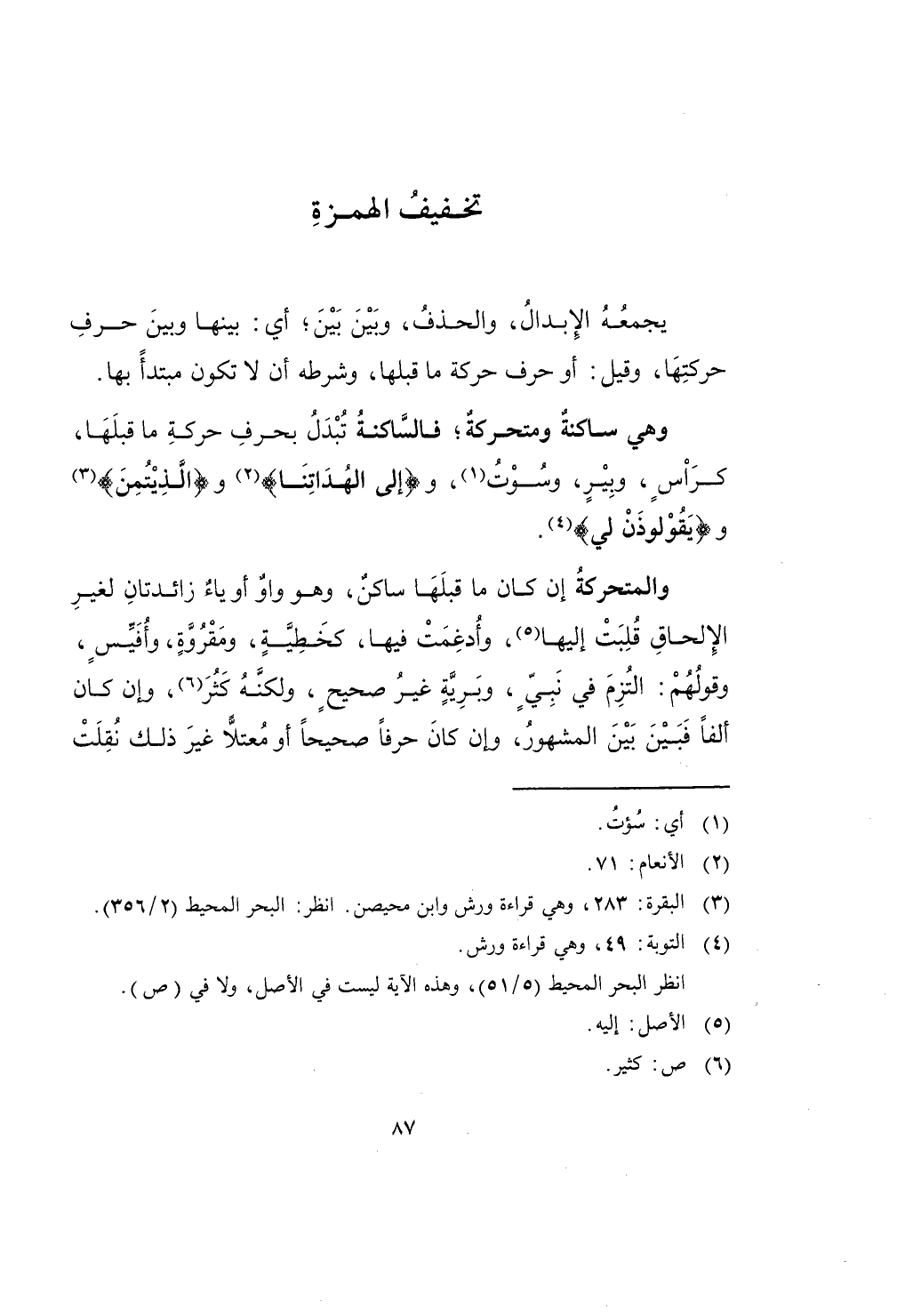 يجمعه الْإِبْدَال والحذف وَبَين بَين أَي بَينهَا وَبَين حرف حركتها وَقيل أَو حرف حَرَكَة مَا قبلهَا وَشَرطه أَن لَا تكون مُبْتَدأ بهَا