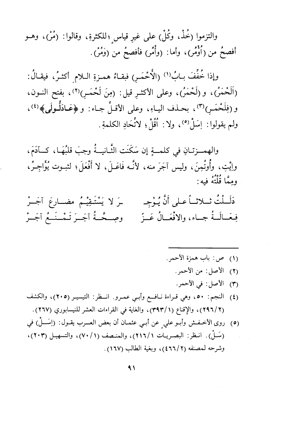 وَإِذا خفف بَاب الْأَحْمَر فبقاء همزَة اللَّام أَكثر فَيُقَال الْحمر ولحمر وعَلى الْأَكْثَر قيل من لحمر بِفَتْح النُّون وفلحمر بِحَذْف الْيَاء وعَلى الْأَقَل جَاءَ وعادلولى وَلم يَقُولُوا اسل وَلَا اقل لِاتِّحَاد الْكَلِمَة