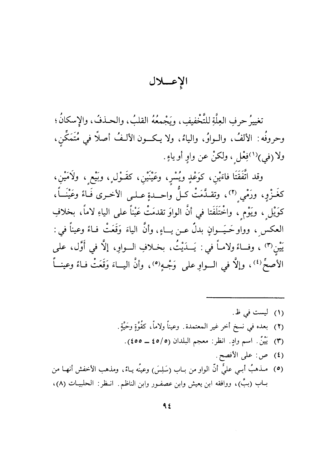 تَغْيِير حرف الْعلَّة للتَّخْفِيف ويجمعه الْقلب والحذف والإسكان وحروفه الْألف وَالْوَاو وَالْيَاء وَلَا يكون الْألف أصلا فِي مُتَمَكن وَلَا فِي فعل وَلَكِن عَن وَاو أَو يَاء