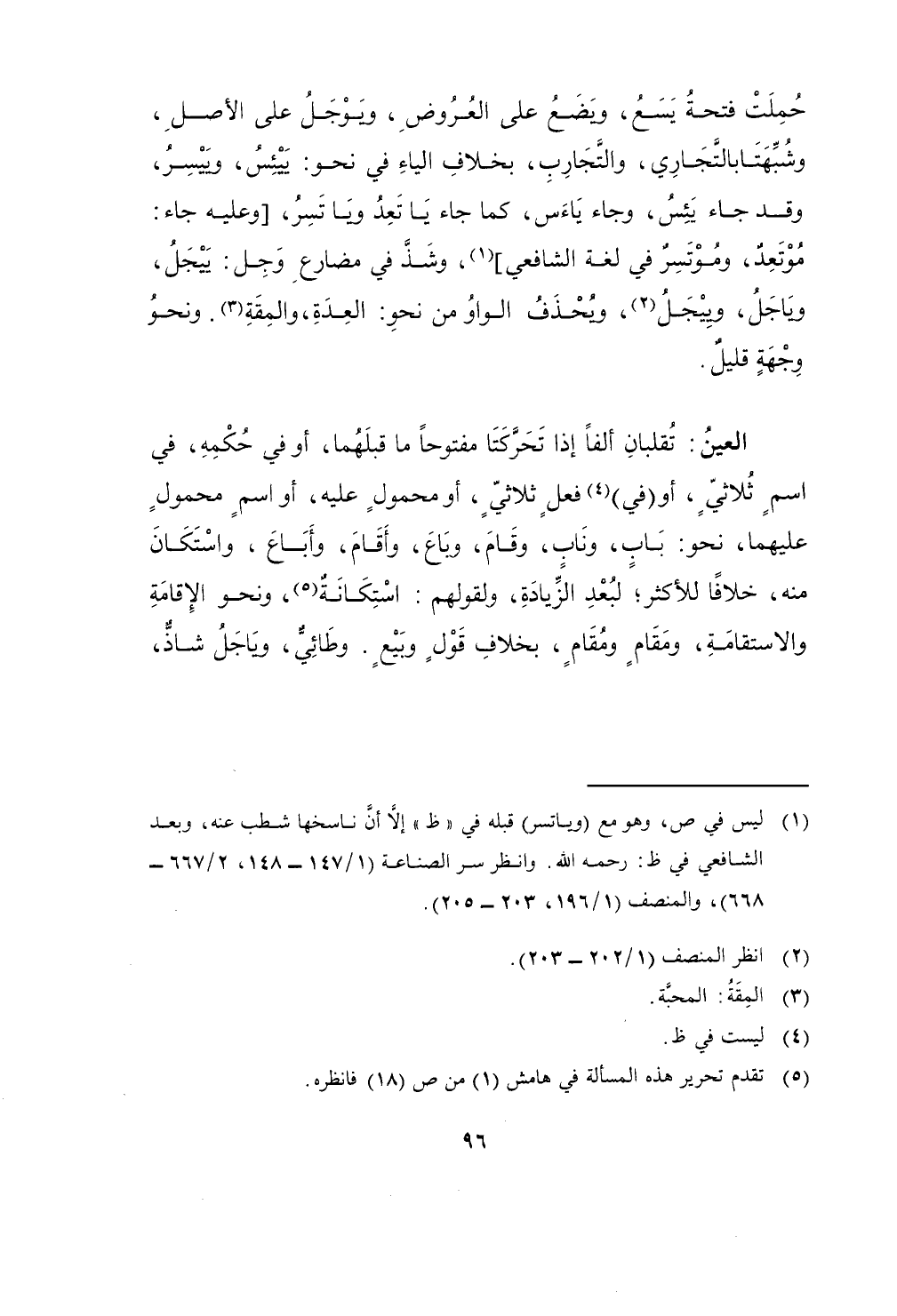 حملت فَتْحة يسع وَيَضَع على الْعرُوض ويوجل على الأَصْل وشبهتا بالتجاري والتجارب بِخِلَاف الْيَاء فِي نَحْو ييئس وييسر وَقد جَاءَ يئس وَجَاء ياءس كَمَا جَاءَ يَا تعد وَيَا تسر وَعَلِيهِ جَاءَ موتعد وموتسر فِي لُغَة الشَّافِعِي وشذ فِي مضارع وَجل ييجل وياجل وييجل ويحذف الْوَاو من نَحْو الْعدة والمقة وَنَحْو وجهة قَلِيل