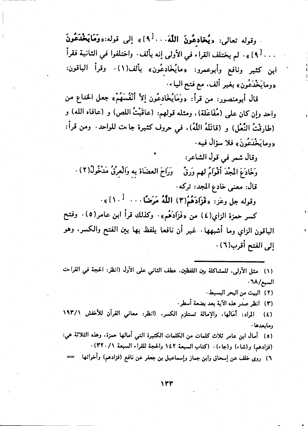 واختلفوا في الثانية فقرأ ابن كثير ونافع وأبو عمرو: (ما يُخَادعُون) بألف. وقرأ الباقون: (وَمَا يَخْدَعُونَ) بغير ألف، مع فتح الياء.