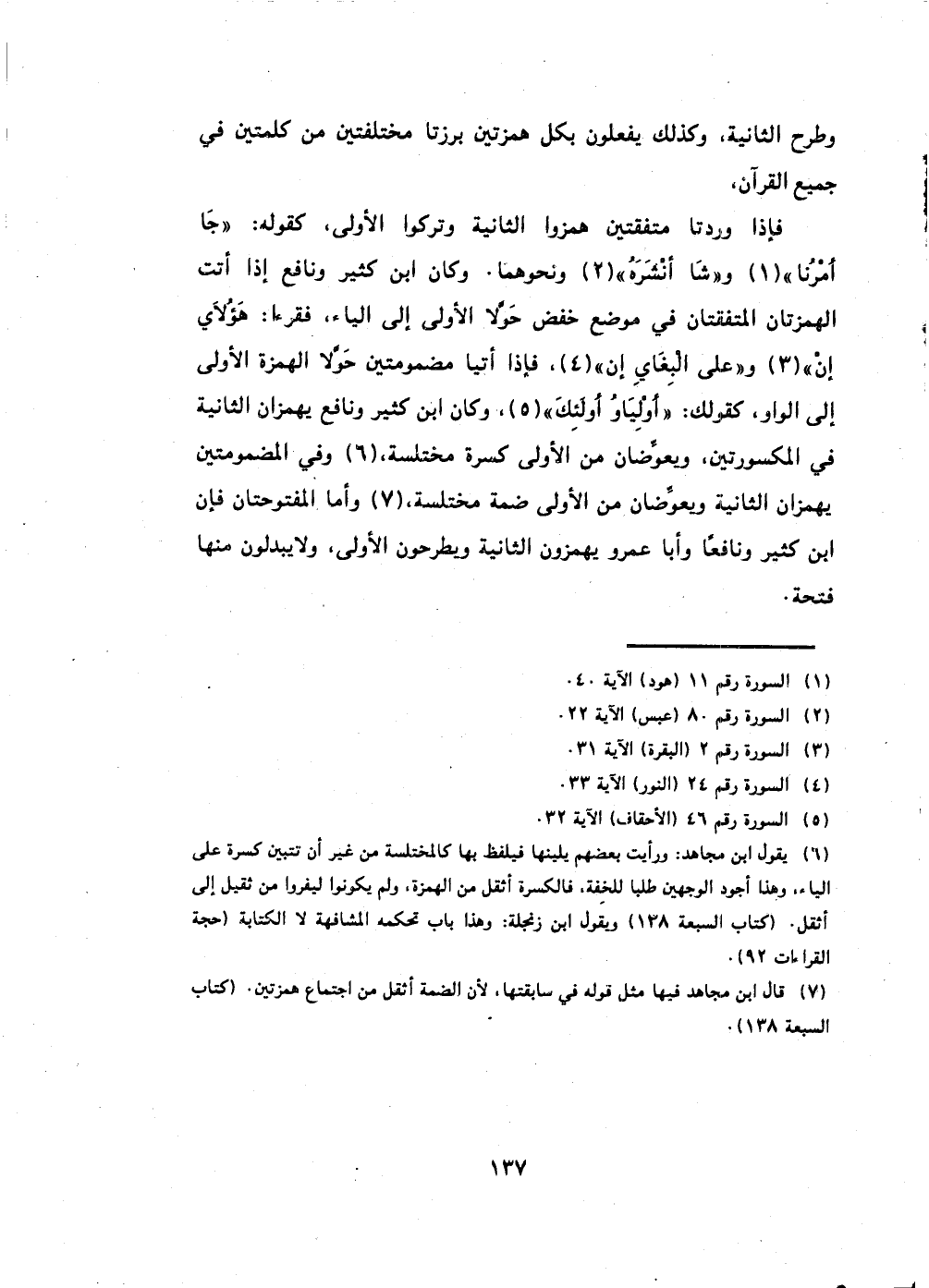 وكان ابن كثير ونافع إذا أتت الهمزتان المتفقتان في موضع خفض حَوَّلا الأولى إلى الياء، فقرءا: (هَؤُلاي إن) و (على البغَايِ إن) ، فإذا أتيا مضمومتين حَوَّلا الهمزة الأولى إلى الواو، كقولك: (أؤلِيَاوُ أولئِكَ) ،