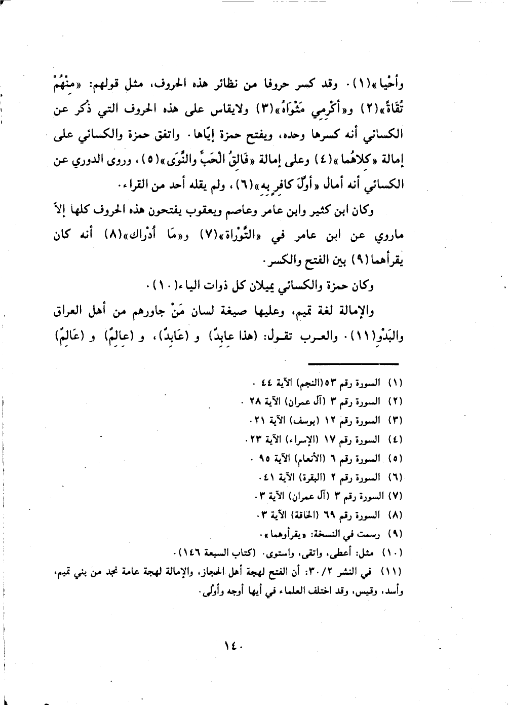 (أَمَاتَ وَأَحْيَا) . وقد كسر حروفا من نظائر هذه الحروف، مثل قولهم: (مِنهُم تُقَاةً) و (أكرِمِي مَثْوَاه) ولا يقاس على هذه الحروف التي ذكر عن