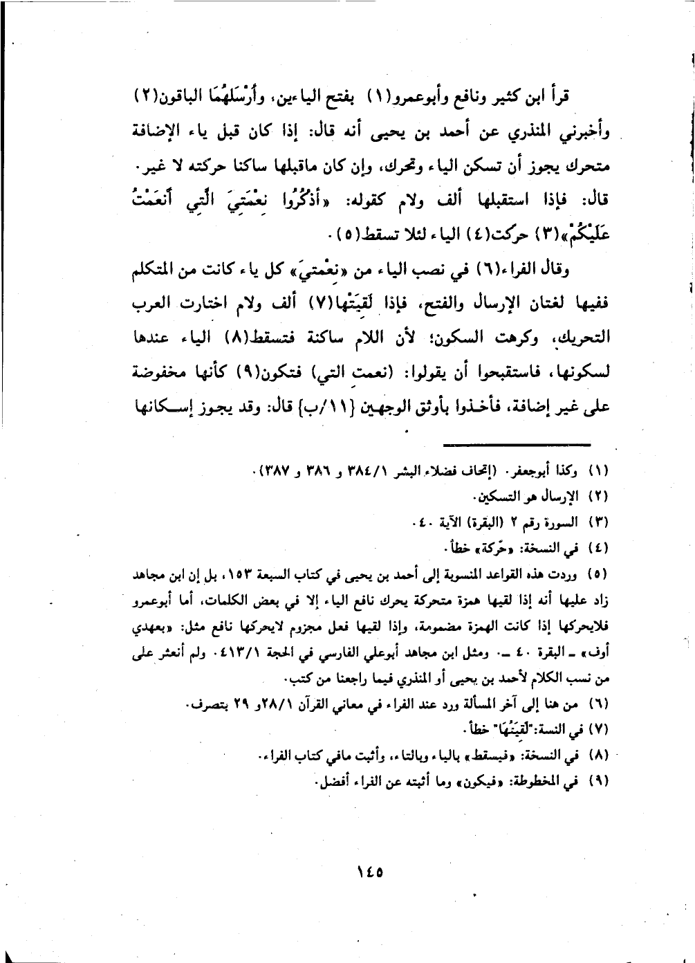 قال: فإذا استقبلها ألف ولام كقوله: (اذْكُرُوا نِعْمَتِيَ الَّتِي أَنْعَمْتُ عَلَيْكُمْ) حركت الياء لئلا تسقط.