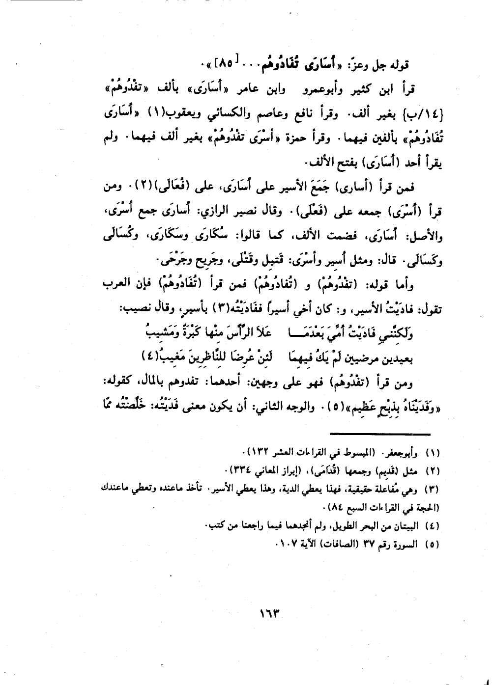 وأما قوله: (تفدُوهُم) و (تُفادُوهُم) فمن قرأ (تُفَادُوهُم) فإن العرب