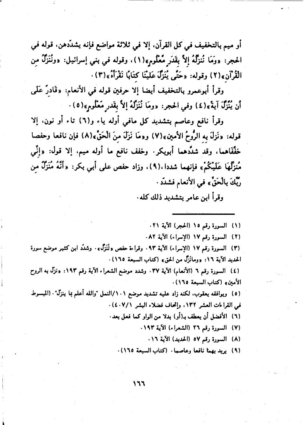أو ميم كالتخفيف في كل القرآن، إلا في ثلاثة مواضع فإنه يشددهن، قوله في الحجر: (وَمَا نُنَزِّلُهُ إِلَّا بِقَدَرٍ مَعْلُومٍ) ، وقوله في بني إسرائيل: (ونُنَزل مِن