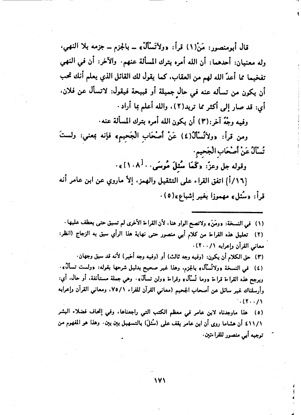 قال أبو منصور: مَن قرأ: (وَلَا تَسْأَلْ) - بالجزم - جزمه بـ (لا) النهي،
