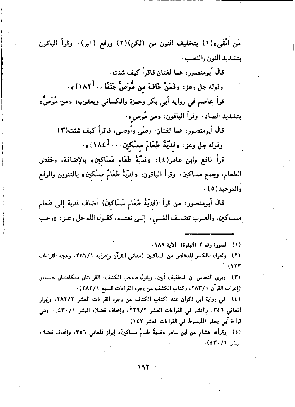 قال أبو منصورة مَنْ قَرَأَ (فِدْيَةُ طَعَامِ مِسَاكِينَ) أضاف فدية إلى طعام